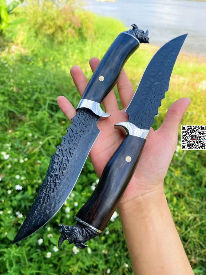 表面工艺:怀旧沧桑复古黑工艺,保留锻打锤纹,刀尾镶嵌雄鹰钢头、可以当求生锤子敲打工具,