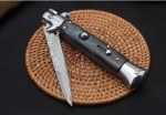 意大利黑手党使用的经典刀具-赌徒跳刀,在电影"教父"里出尽了风头!大马士革刃的黑手党侧跳,弹力超强,锁定到位,大马士革枪刺刃,带有保险装置,刀护手处暗藏闭合开关,出口产品,质量保证!满足把玩和收藏需要