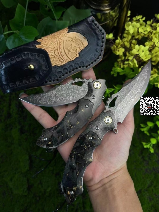 新品上架【鹰眼·折叠刀】出口版一款非常帅气的EDC折叠刀,日本进口大马士革钢制作,刀身拥有出色的锋利度和60HRC硬度,针尖型刀尖能提供足够的穿透力、滚轴轴承快开系统,单手轻松操作,刀柄设计比较符合人体工程学,搭配金粉碳纤维材质手柄、可以保证在使用的时候不会轻易地脱手,方便携带和快速出刀,高品质手工打造、皮套手工雕刻完成,、非常不错的一款折叠刀、出口订单数量有限。