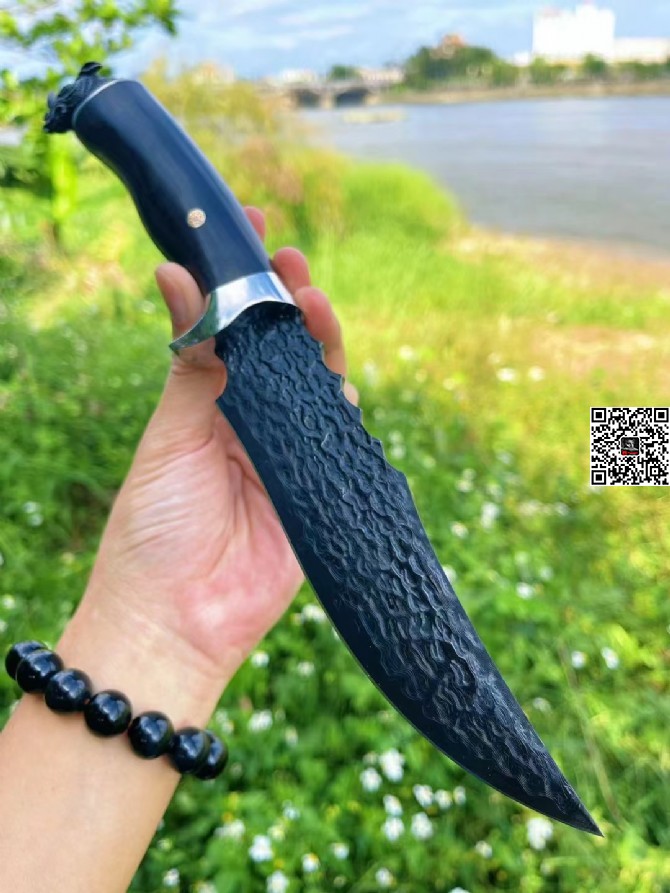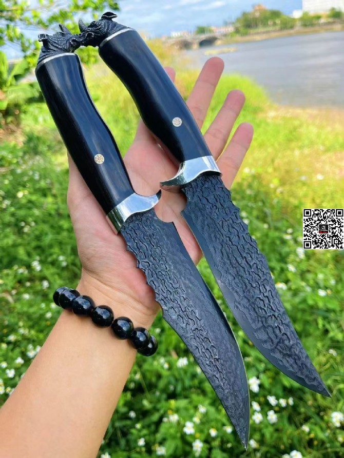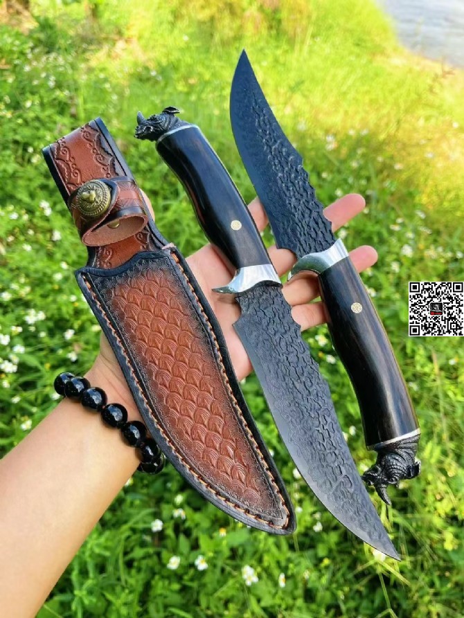 【黑犀牛】该刀用67层大马士革锻打祥云纹,专业真空热处理、硬度达到60HRC,国际一级锋利度标准水冷手工开刃,刀刃工艺采用手工反复锻造而成祥云纹、复古不锈钢刀隔,尾部镶嵌鹰头,形态生动,霸气!整刀金属采用最新复古黑工艺,防锈卓越,不掉色、耐刮花刀刃!刀刃设计尖锐,手柄采用老料非洲黑檀木,老师傅纯手工打砂精釉抛光,手感极佳,每一把刀细节都是独一无二,值得每一位刀友们收藏臻品!