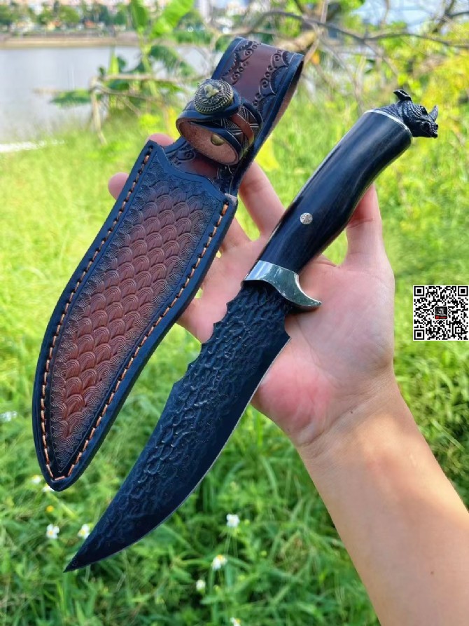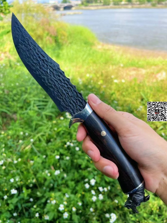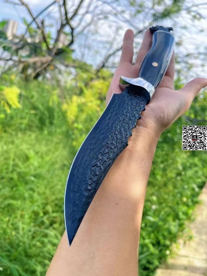 表面工艺:怀旧沧桑复古黑工艺,保留锻打锤纹,刀尾镶嵌雄鹰钢头、可以当求生锤子敲打工具,