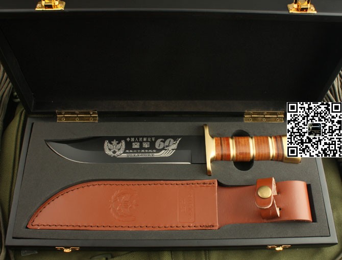 备 注:一般情况下,请不要拆开手柄;一旦拆开,要按照原有的顺序,将部件逐件复原,还需要很专业的人士才能拼装好为纪念空军建军60周年而制作的纪念战刀,这是一把伟大的军刀,献给我们伟大的军队!他的造型和美国卡巴军刀有点类似,在保持了卡巴刀的基本性能之外,更运用了当今做刀的最新技术和材料,造型上更加的经典!有专业刀具工厂质量监控以及有军方背景的检查员的严格检测下,使该刀拥有高可靠性和始终如一的质量。